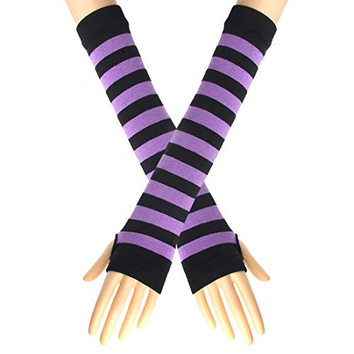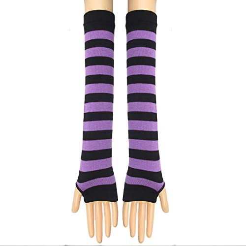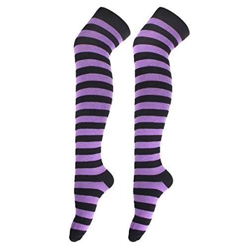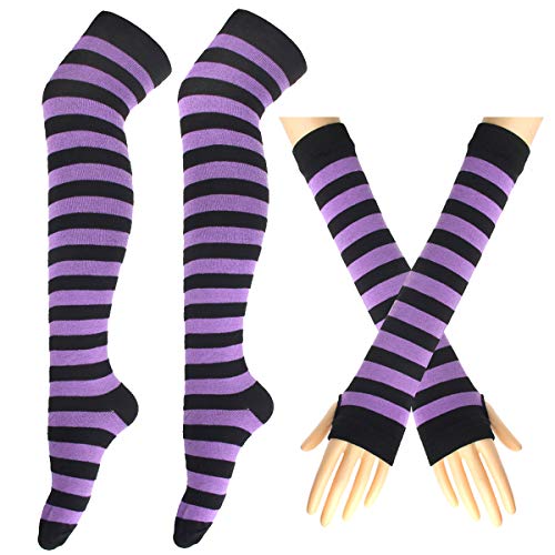 Streep Lange Gebreide Handschoenen Knie Hoge Streep Sokken Leggings Party Kostuum Accessoire 2 Paar Set, Zwart & Licht Paars, one size